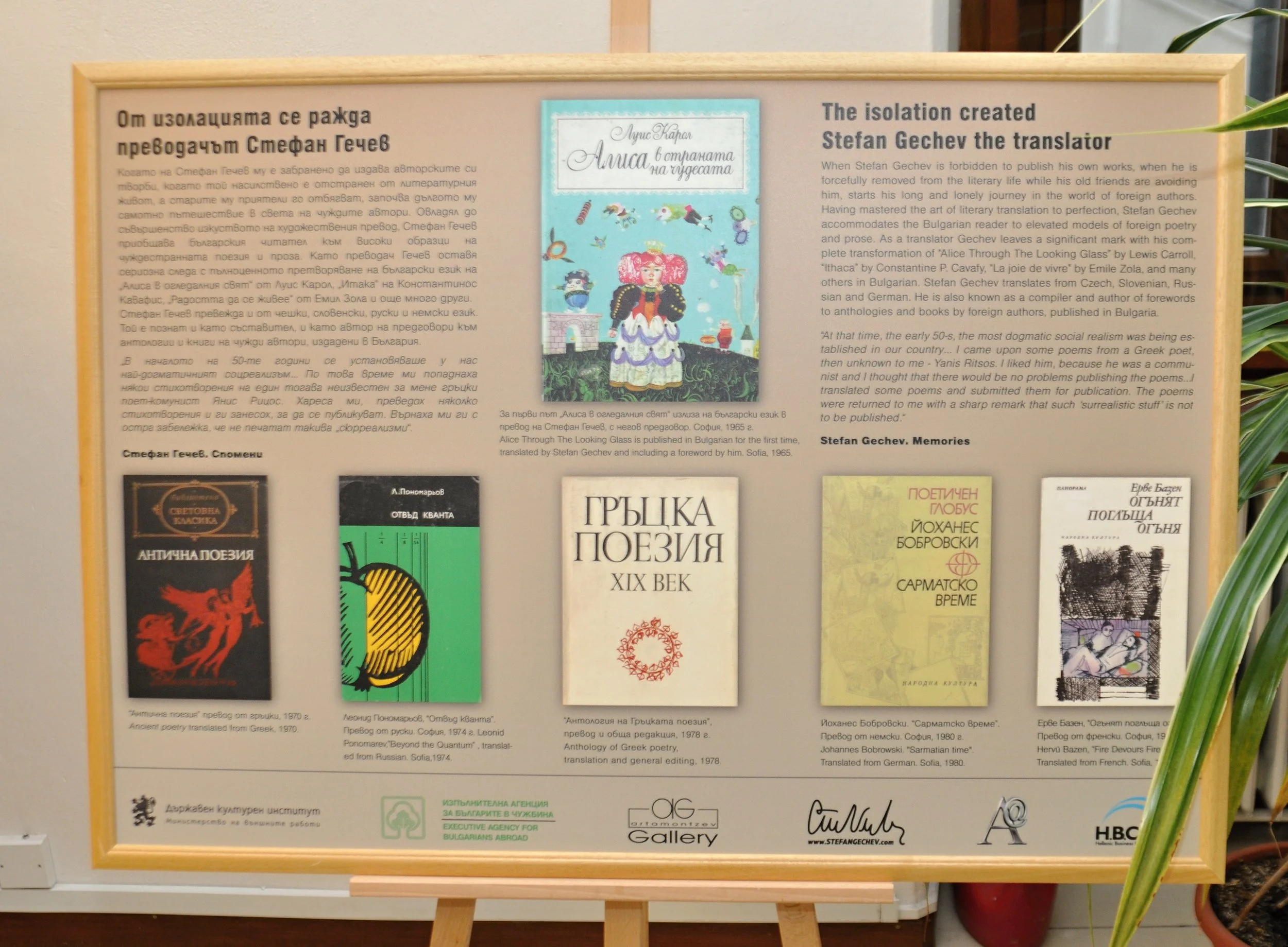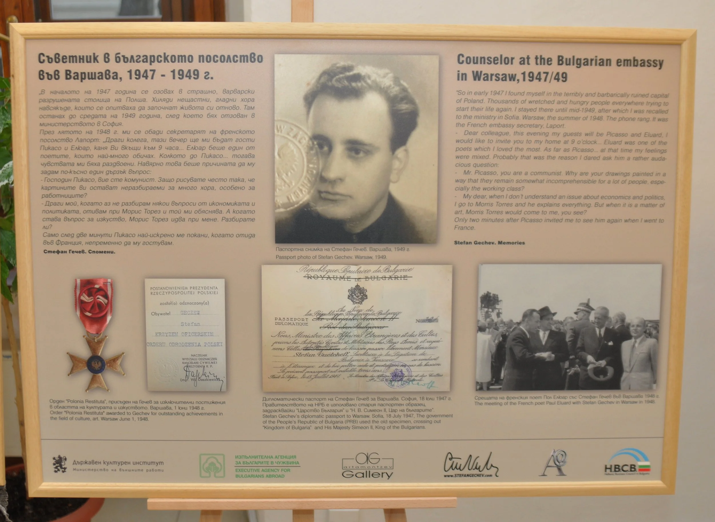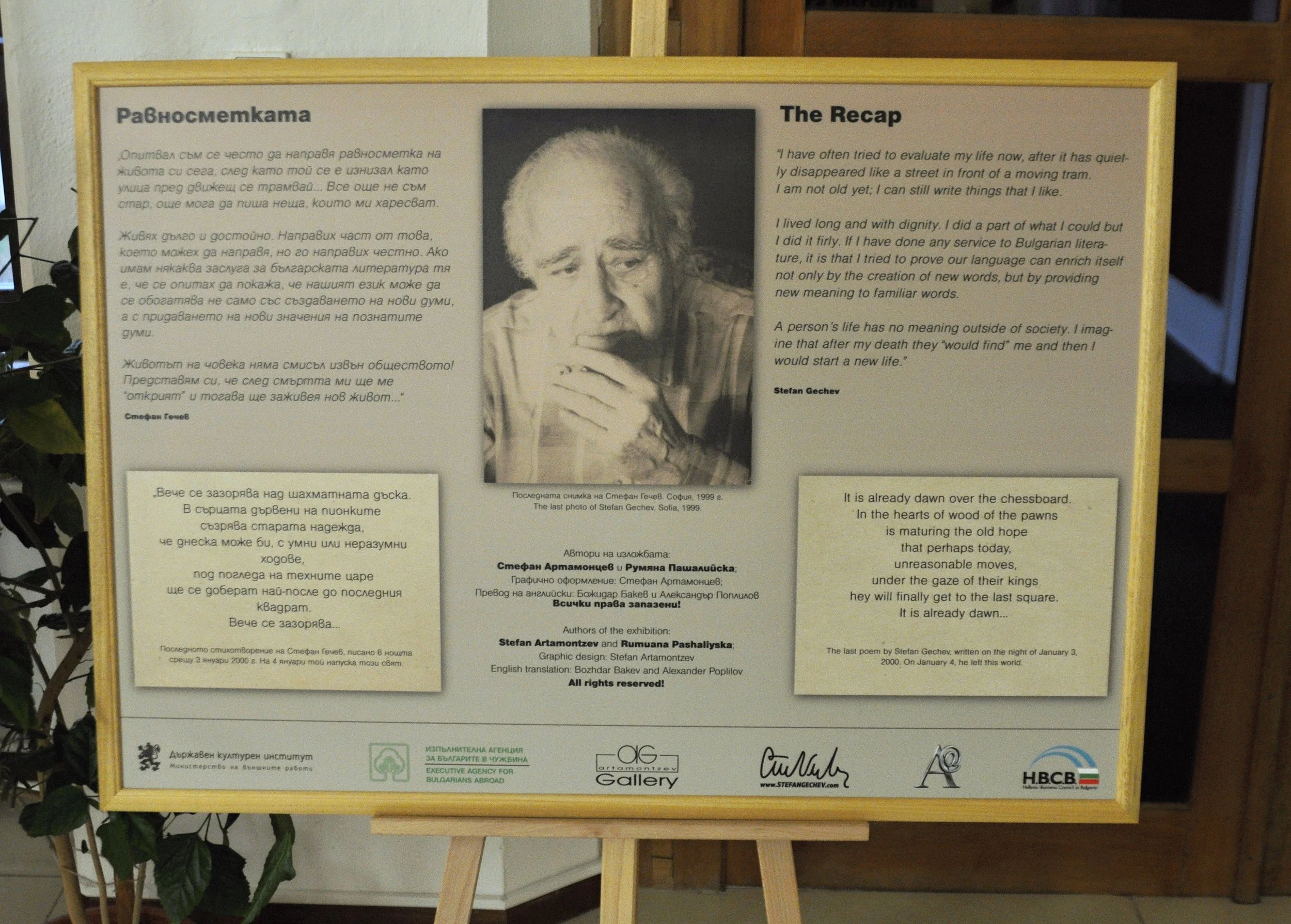 Výstava pozostáva z bohatej škály originálnych materiálov. Obsahuje rukopisy, dokumentov, fotografií, prvé vydania kníh a umeleckých diel, ako aj informácie o rozsiahlych intelektuálnych známostiach a aktivitách Stefana Gečeva. Nechýbajú ani básne, umelecké preklady a memoárové texty autora, zozbierané na 18 paneloch v bulharčine a angličtine, ktoré dopĺňa resumé v slovenčine. Výstava mala veľký úspech v Sofii, Ruse, Plovdive a Budapešti. Okrem Stefana Artamonceva je spoluautorkou výstavy aj Rumjana Pašalijska.